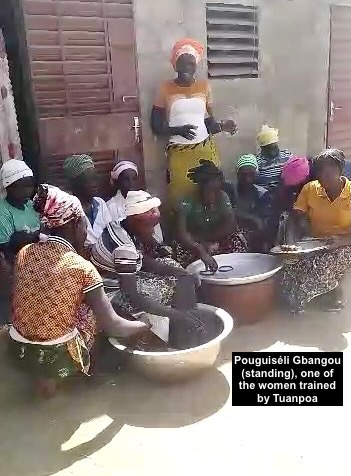 “My name is Pouguiséli Gbangou, and I am one of the women trained by Touanpoa in peanut processing and marketing. We have learnt the processing techniques very well and this helps us a lot in our families. But we have a problem because we do not have enough financial resources to buy our own equipment, so many of us ask Touanpoa to use her equipment to produce our peanut products. We are grateful to Touampoa for agreeing to offer us free training. She trained us all at no cost because she is truly very humble, very serious and very loving towards us, and all her qualities helped us to learn well with her. We sincerely thank Touanpoa for her great love for us, her comrades.”